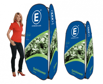 Der Quicktower ist eine mobile Werbesäule mit drei unterschiedlich bedruckbaren Wänden. Dank Federstahlrahmen entfaltet sich der Quicktower von selbst. Nach dem Auseinanderfalten werden die offenen Enden mit Klettverschluss verbunden. Der Quicktower lässt sich in Sekunden auf- und wieder abbauen.