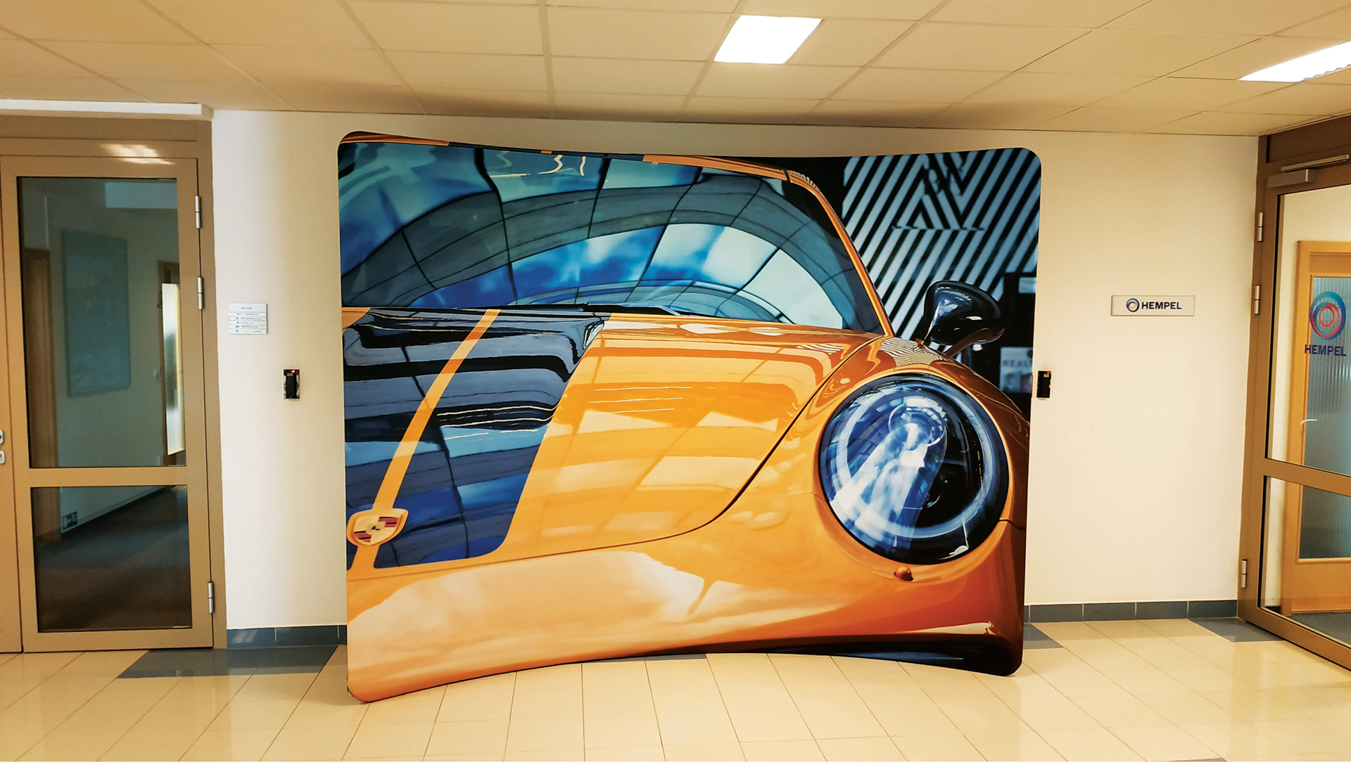 Die Easy-Zip Messewand ist eine leichte, mobile Textilwand, die eine große Werbefläche bietet. Der Polyesterstoff wird im Sublimationsdruck wahlweise ein- oder doppelseitig bedruckt und ist beständig gegen mechanische Einflüsse. Das Material ist B1-zertifiziert und daher für die Nutzung in öffentlichen Gebäuden geeignet.