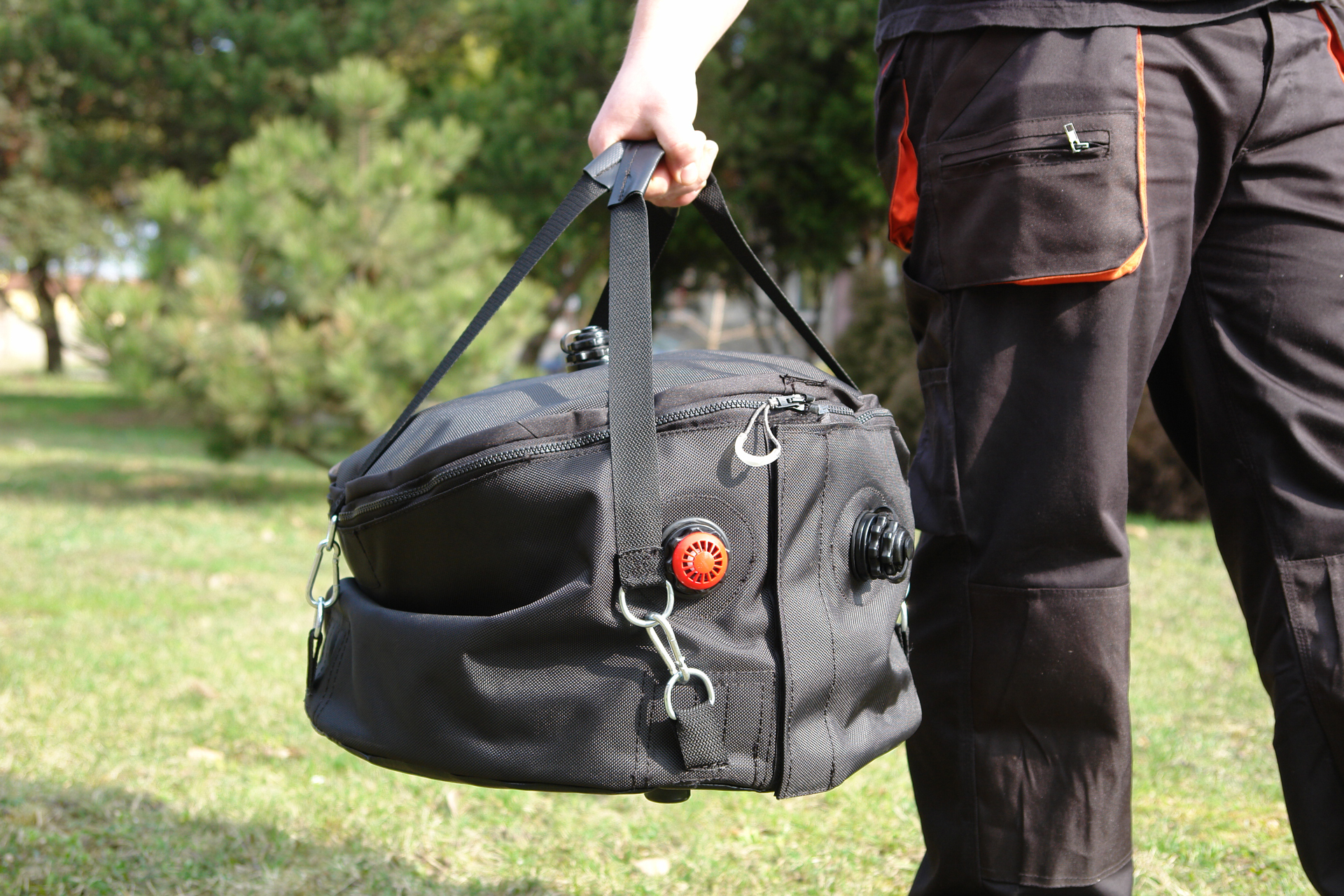 Für den Abbau und Transport werden die beiden Ventile an der Säule geöffnet, damit die Luft entweichen kann. Die Stoffhülle wird dann zusammen gefaltet und im Standfuß verstaut. Der Fuß fungiert gleichzeitig als Transporttasche. So lässt sich die Vento Säule kompakt verstauen und einfach transportieren.