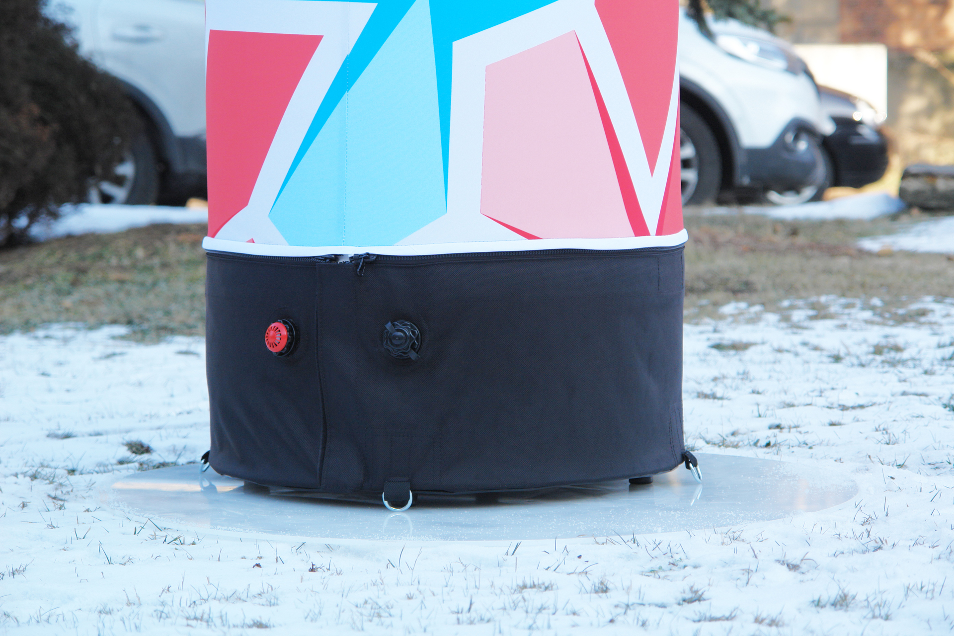Das schafft die aufblasbare Säule dank des VENTO-Systems, das aus zwei Teilen besteht: einer inneren PVC-Blase, und einer äußere Polyesterhülle. Die innere Blase hält, einmal aufgeblasen, die Luft fest. Das geht dank eines speziellen, sehr robusten PVCs und einer zusätzlich besonderen Verarbeitung, die es luftdicht macht. Der leichte, äußere Polyesterstoff ist das, was man von der Säule sieht. Dieser kann bedruckt oder teilbedruckt werden, weiß sein oder auf Anfrage in einer von 12 verschiedenen Farben ausgewählt werden.