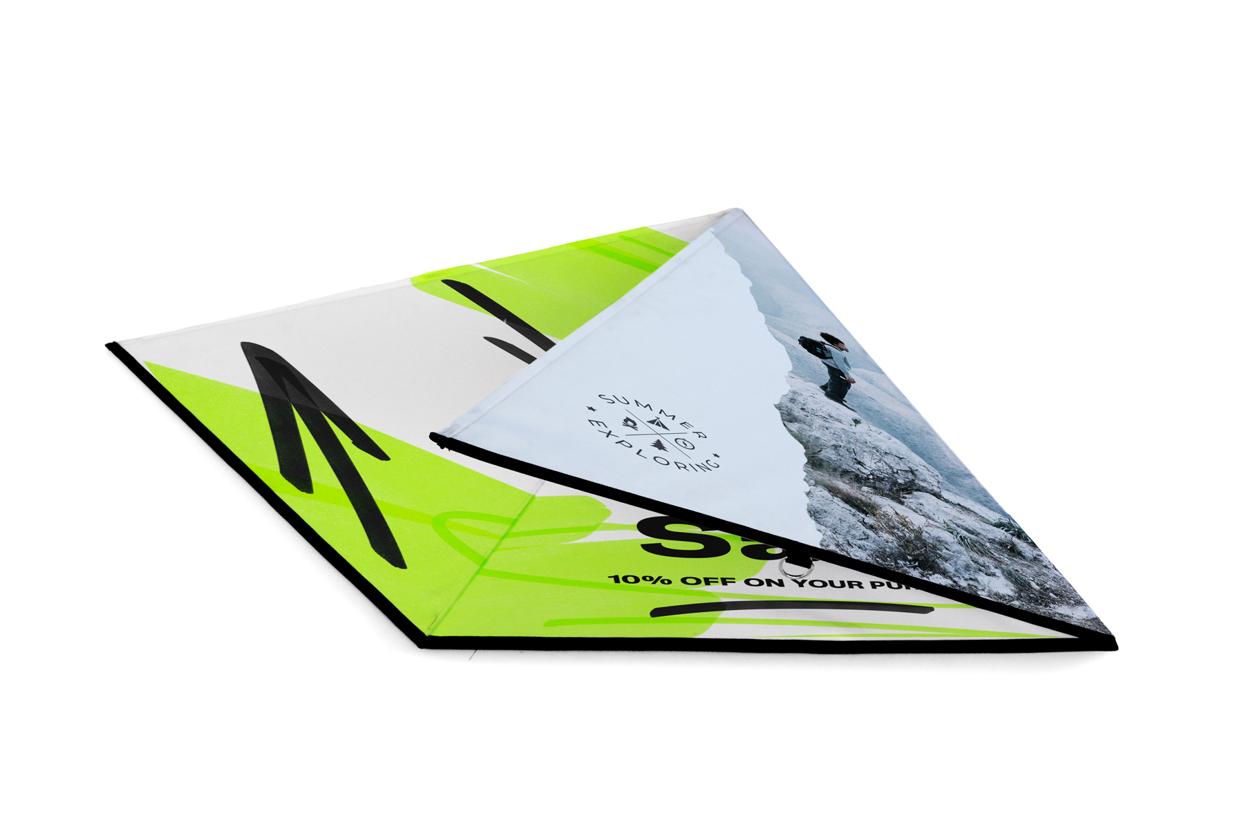 Da sie flach zusammenfaltbar sind, lassen sie sich leicht transportieren und platzsparend lagern. Die Seitenteile bestehen aus leichten, stabilen HDF-Platten, mit einem Bezug aus strapazierfähigem, imprägniertem Polyesterstoff. Magnete am Rand der Pyramide verhindern versehentliches Zusammenklappen. Für zusätzliche Stabilität sorgt ein auf einer Seite angebrachter Halbring, mit dem die Pyramide auf dem Boden befestigt werden kann.Brillanter Digitaldruck für Ihre Markenbotschaft